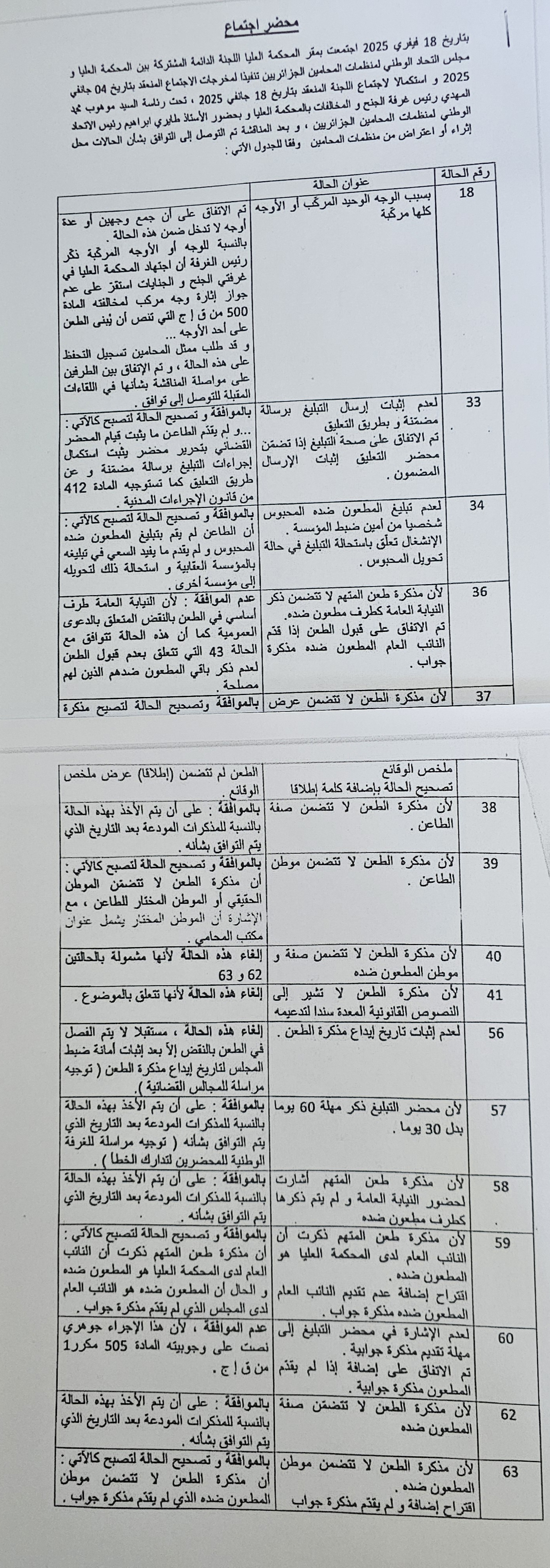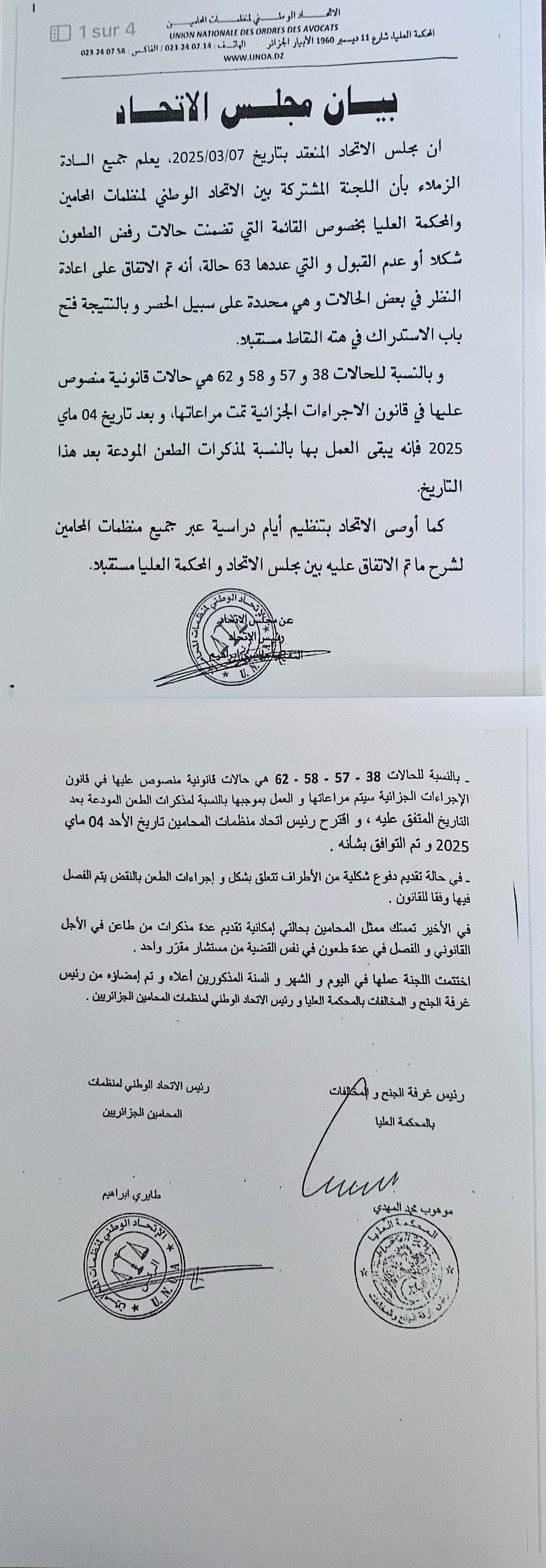 Ce durcissement de cas d’irrecevabilités du mémoire de pourvoi et leur extension à des cas de pure forme a donc fait réagir l’Union national des ordres des avocats qui a sollicité un débat sur cette question , ce que la présidence de la Cour suprême accepta volontiers .Une rencontre entre l’Ordre des avocats et les hauts magistrats de la Cour suprême a été tenue le 4 janvier 2025 où il a été convenu de l’installation d’une commission mixte permanente composée de la Cour suprême et de l’Union nationale des ordres des avocats chargée entre autres de réviser et d’enrichir dans les meilleurs délais la directive du 1er septembre 2024 , l’organisation de rencontres de coordination entre les deux organes, l’ouverture d’un recours en rectification des ordonnances et arrêts susceptibles de contenir des erreurs d’appréciation , et enfin l’accord sur la nécessité de proposer des recommandations conjointes pour la révision des dispositions relatives au pourvoi en cassation dans le code de procédure pénale.